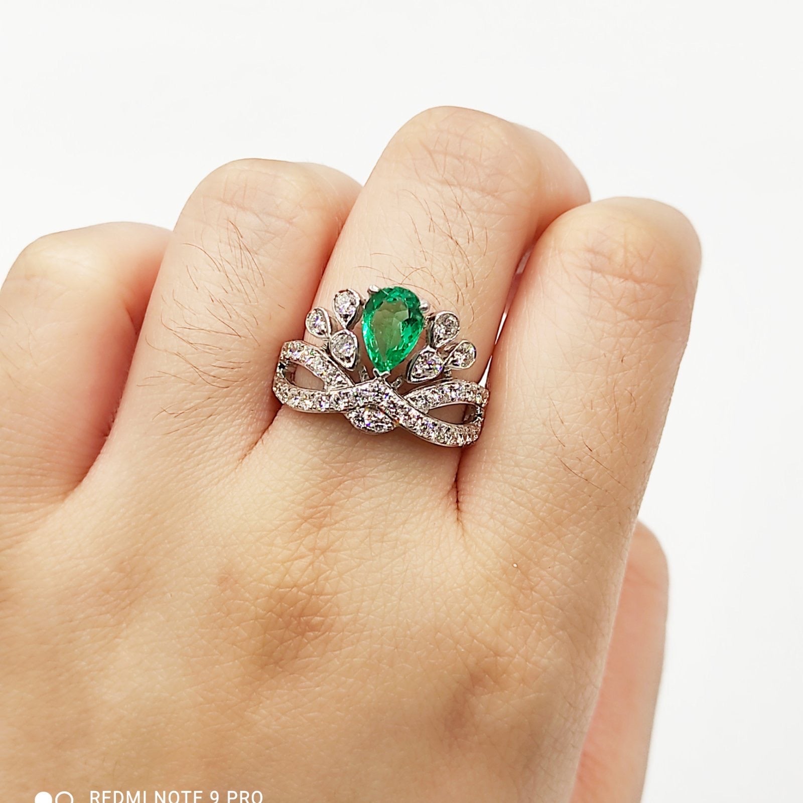 Tiara Crown Ring with Green Emerald and Diamonds 18K Gold