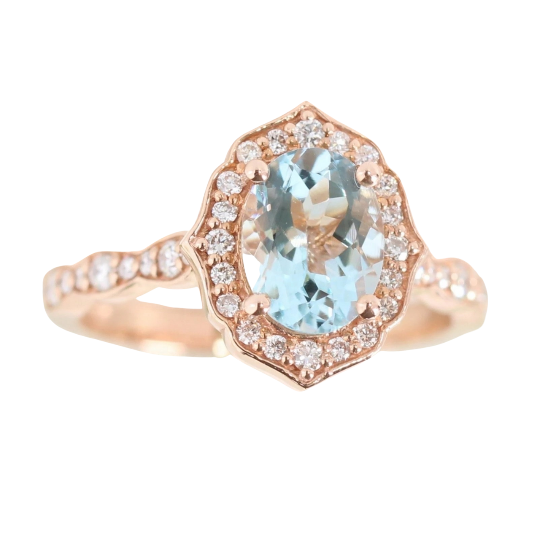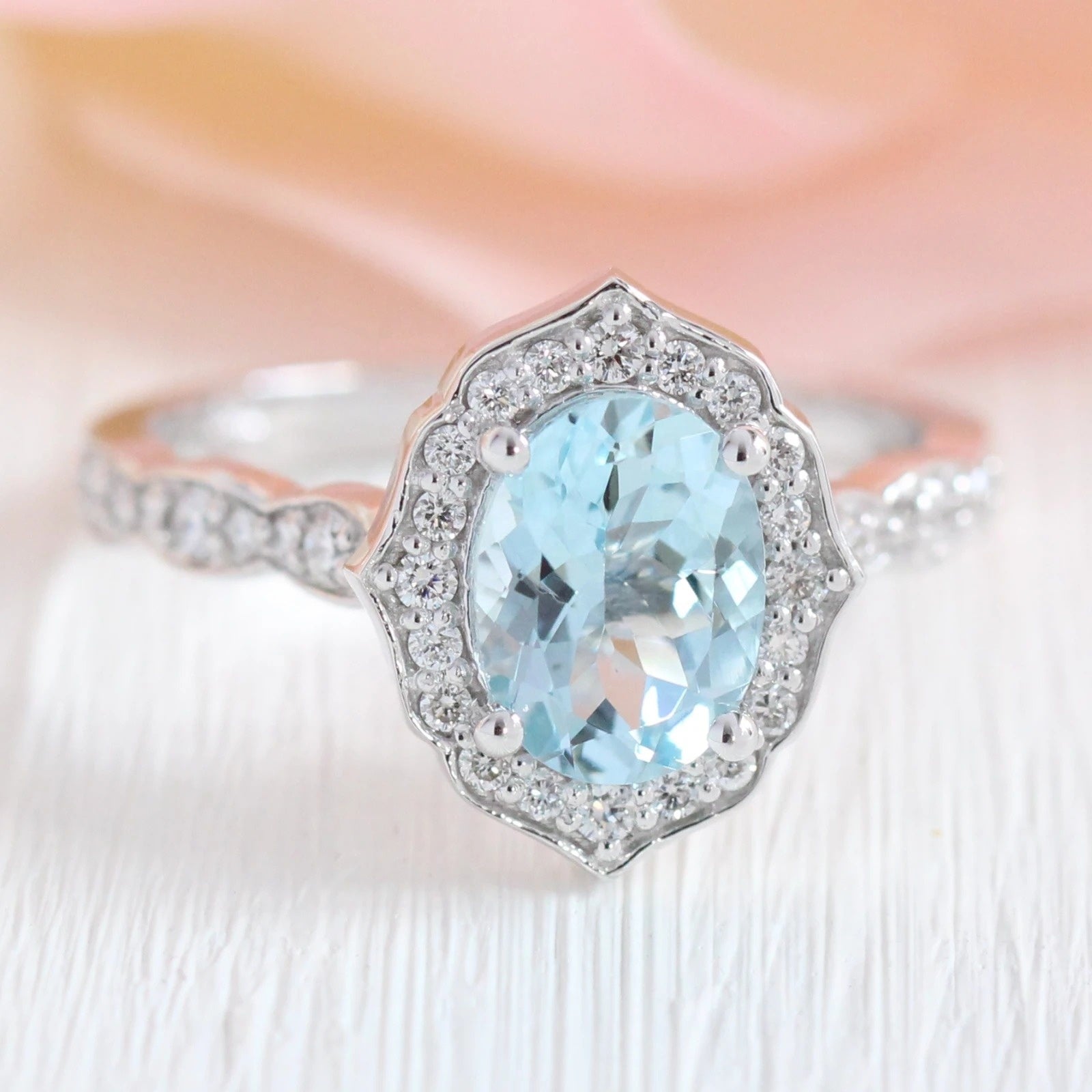 Be the belle of the ball with this elegant Oval Aquamarine Vintage Engagement Ring, crafted from lovely golden tones. Its unique halo design gives off vintage vibes, perfect for a classic bride-to-be. Now you can show off your one-of-a-kind ring with style, and be the envy of everyone you meet!