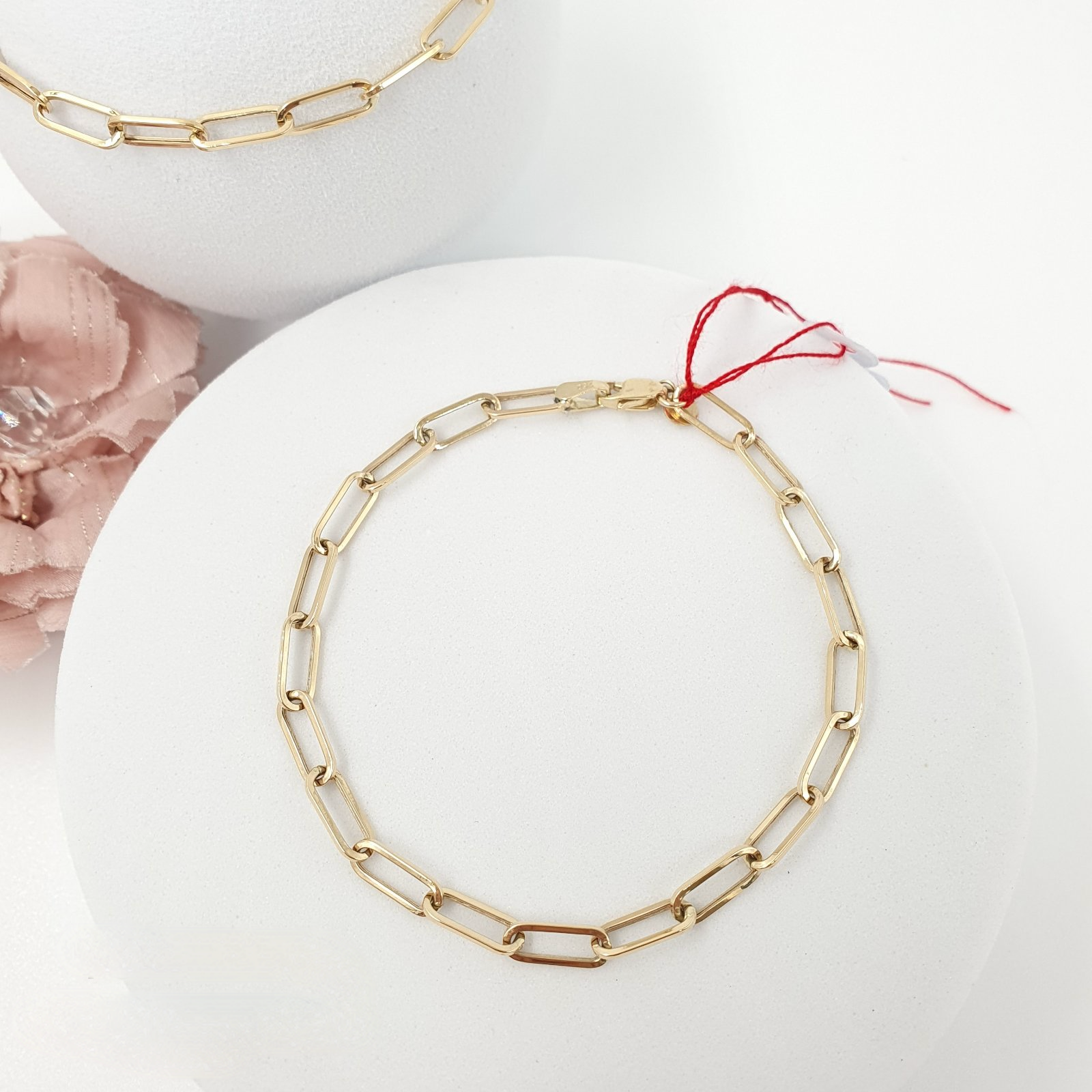 A timeless and elegant accessory, this paperclip chain bracelet is crafted from 18K gold for luxurious style and enduring quality. The sleek, modern design is the perfect way to make a statement, elevating any formal or casual outfit.