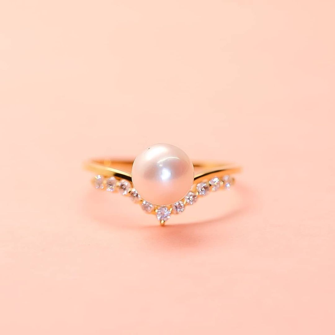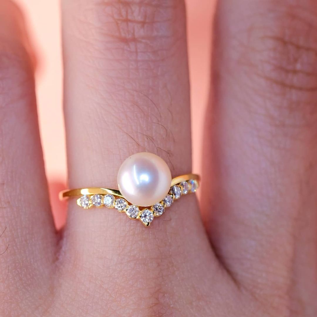 Pearl Diamond Bridal V-Shaped Wedding Ring / Women's Stacking Ring