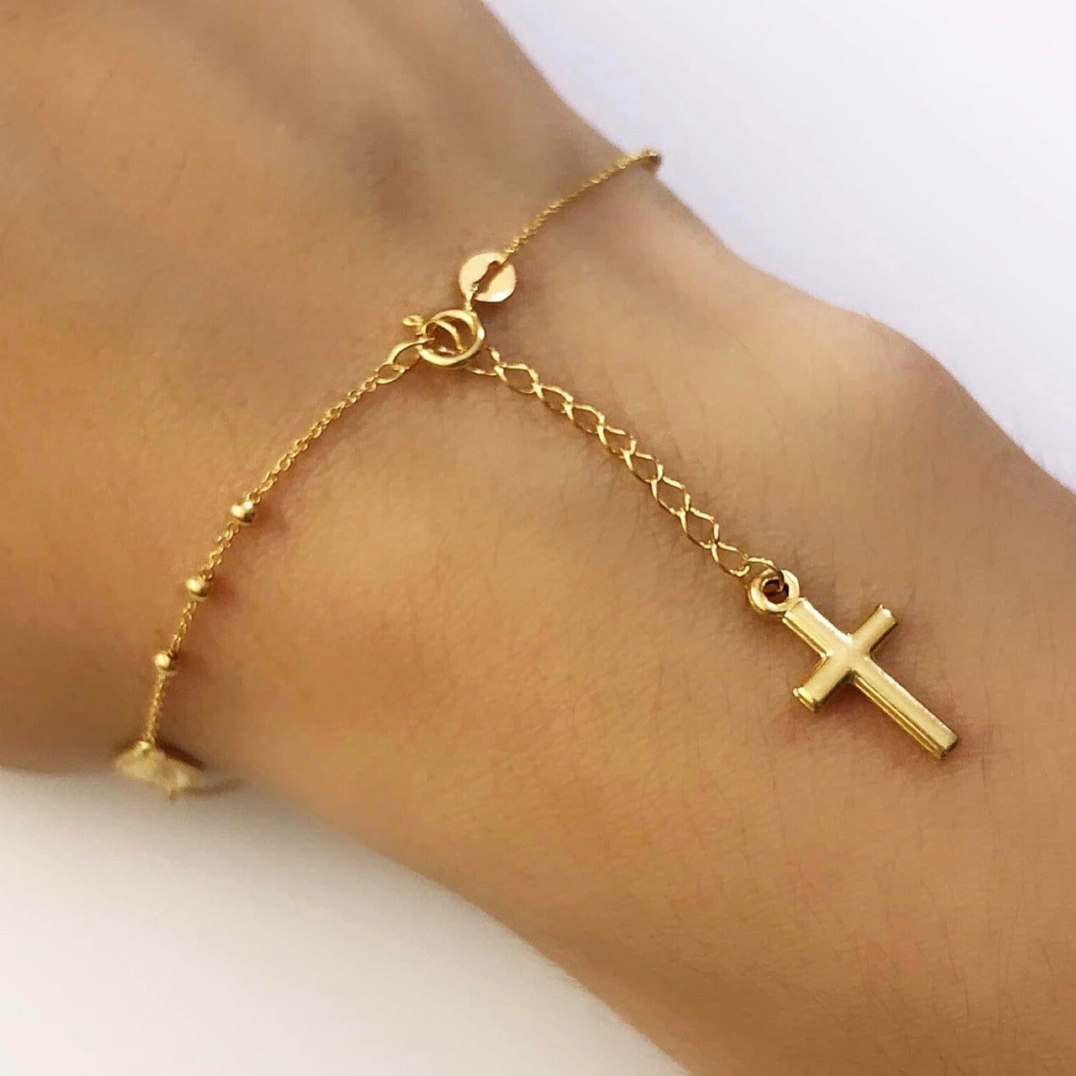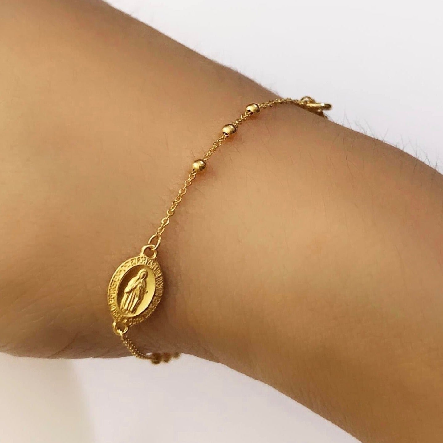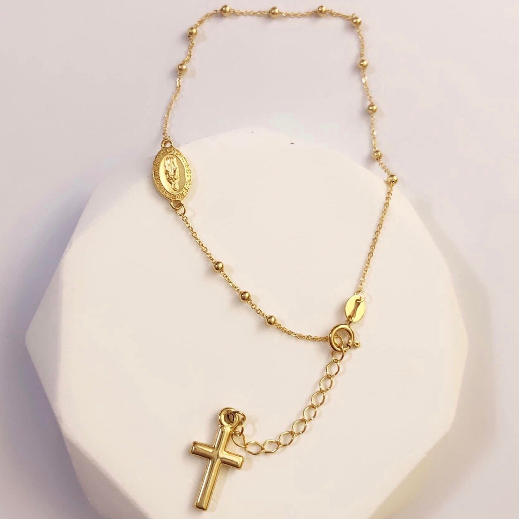 Indulge in luxury with this one-of-a-kind 18K gold rosary bracelet! Strung together with delicate gold chains, this elegant accessory is perfect for any occasion - whether you're headed to church, or just trying to look (and pray) your best!